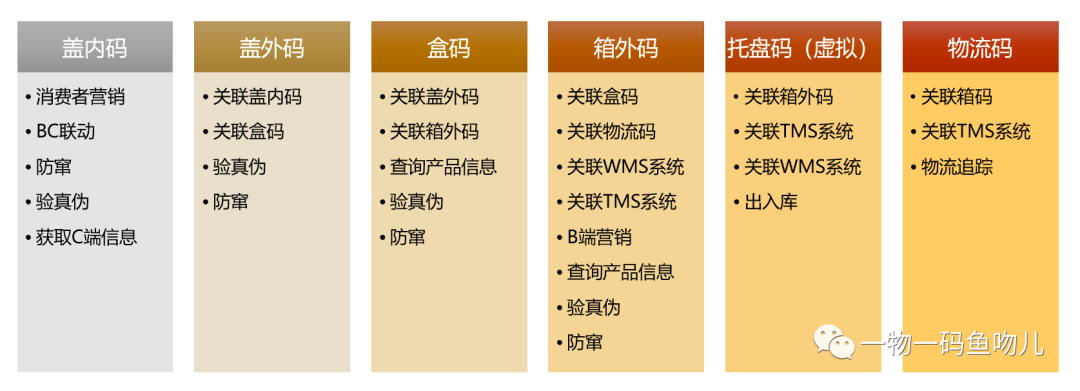 同时,通过多级码的关联,在营销中可以实现不同包装规格的产品,从渠道到消费者的层层关联。比如白酒一物一码营销常见的“垛码—箱码—盒码—瓶码—盖码”五级关联。不同链路的角色扫码,就能够串联起所有的数据记录。