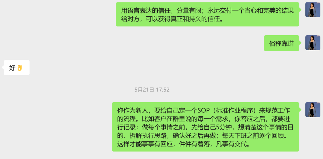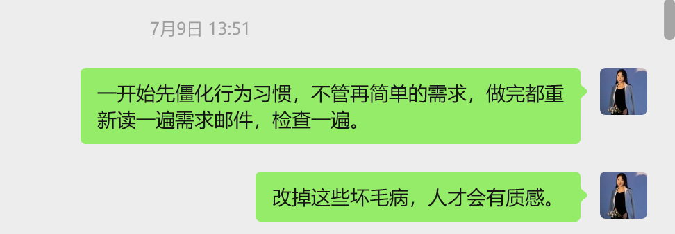 而对工作的审美,我认为是在有限的资源下,尽可能的把事情做得有质感。经你手的任何交付物,就代表着你的taste.跟任何合作伙伴对接,要站在对方立场考虑,尽量交付让对方省心的结果。一些带新人时的经验分享:
