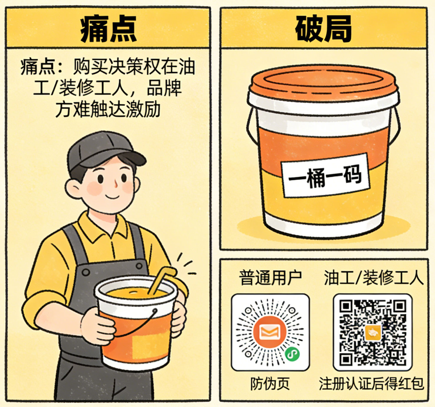 破局: 实行“一桶一码”。系统智能识别身份:普通用户扫码默认查看防伪页;油工/装修工人提前注册认证后,扫码即可获得红包。